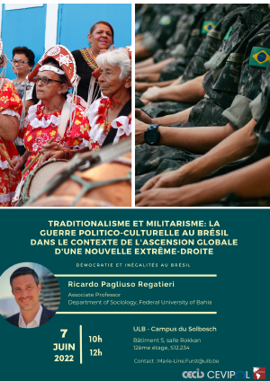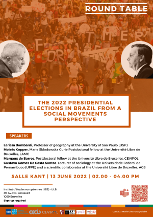 The 2022 Presidential Elections in Brazil from a Social Movements Perspective13 juneSpeakers : Larissa Mies Bombardi, Professor in the Department of Geography at USP since 2007. Moisés Kopper, Marie Curie IF@ULB Postdoc at the Laboratoire d’Anthropologie des Mondes Contemporains. Margaux De Barros, post-doctoral fellow at Cevipol. Gustavo Gomes da Costa, Lecturer of sociology at the Universidade Federal de Pernambuco (UFPE), Brazil. |